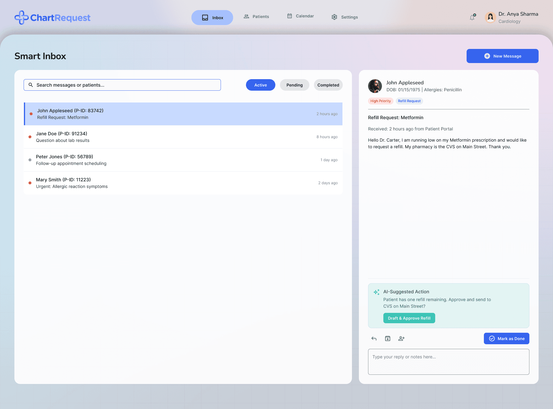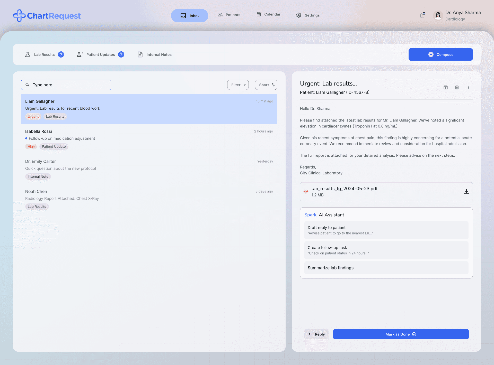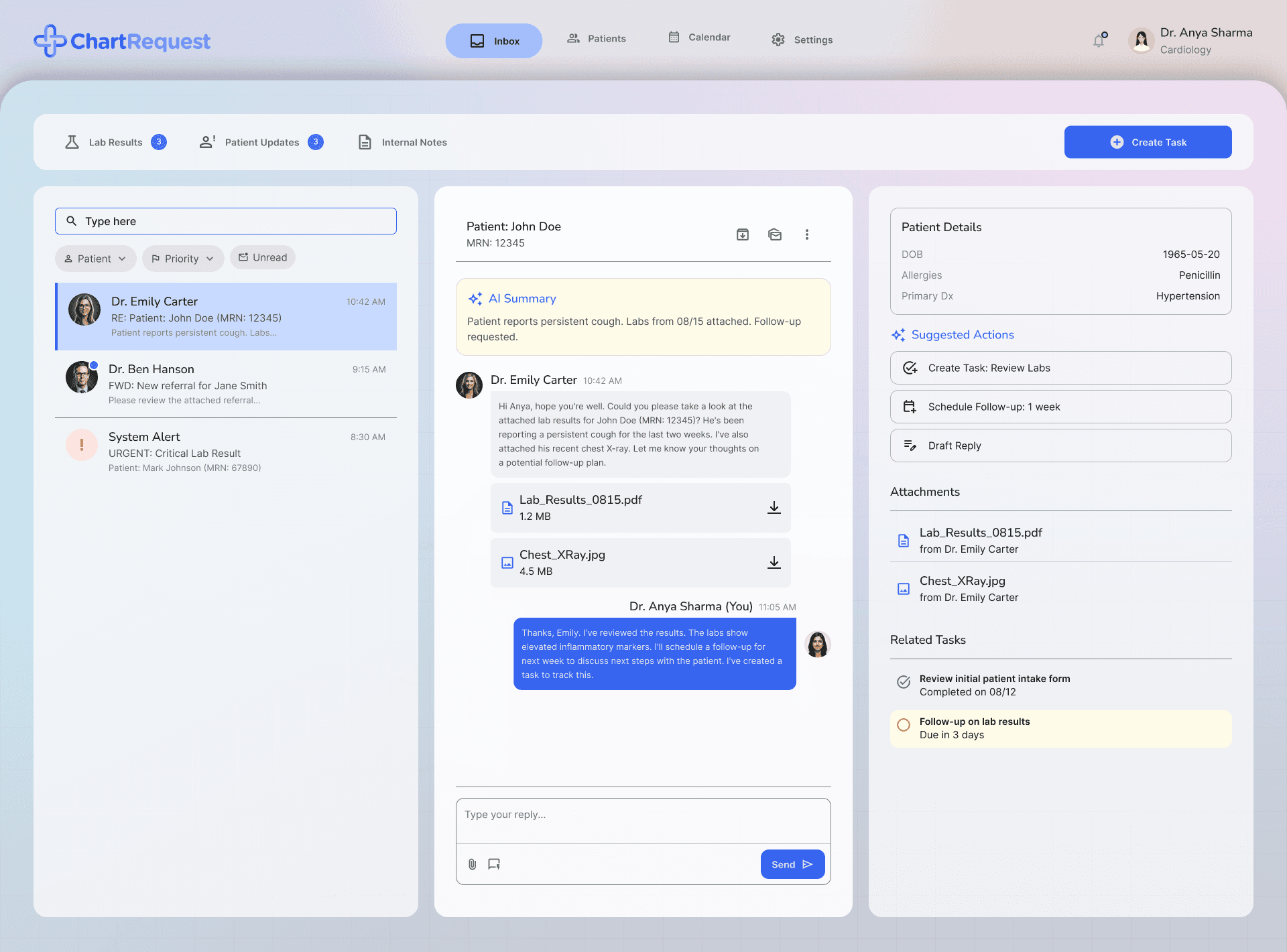 Centralized inbox to manage patient queries, lab results, and updates efficiently.