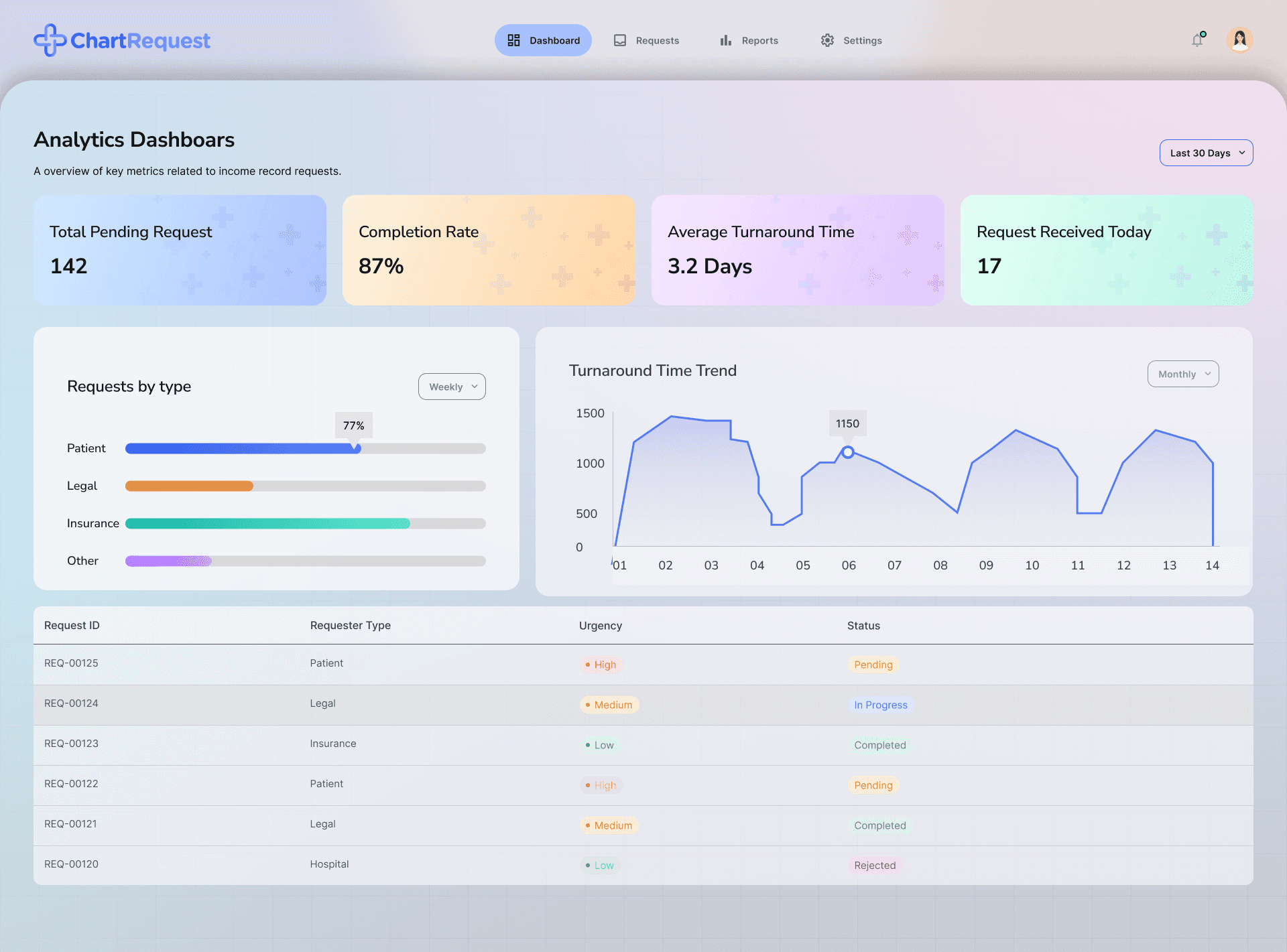 Real-time insights into request volume, turnaround time, and overall system performance.