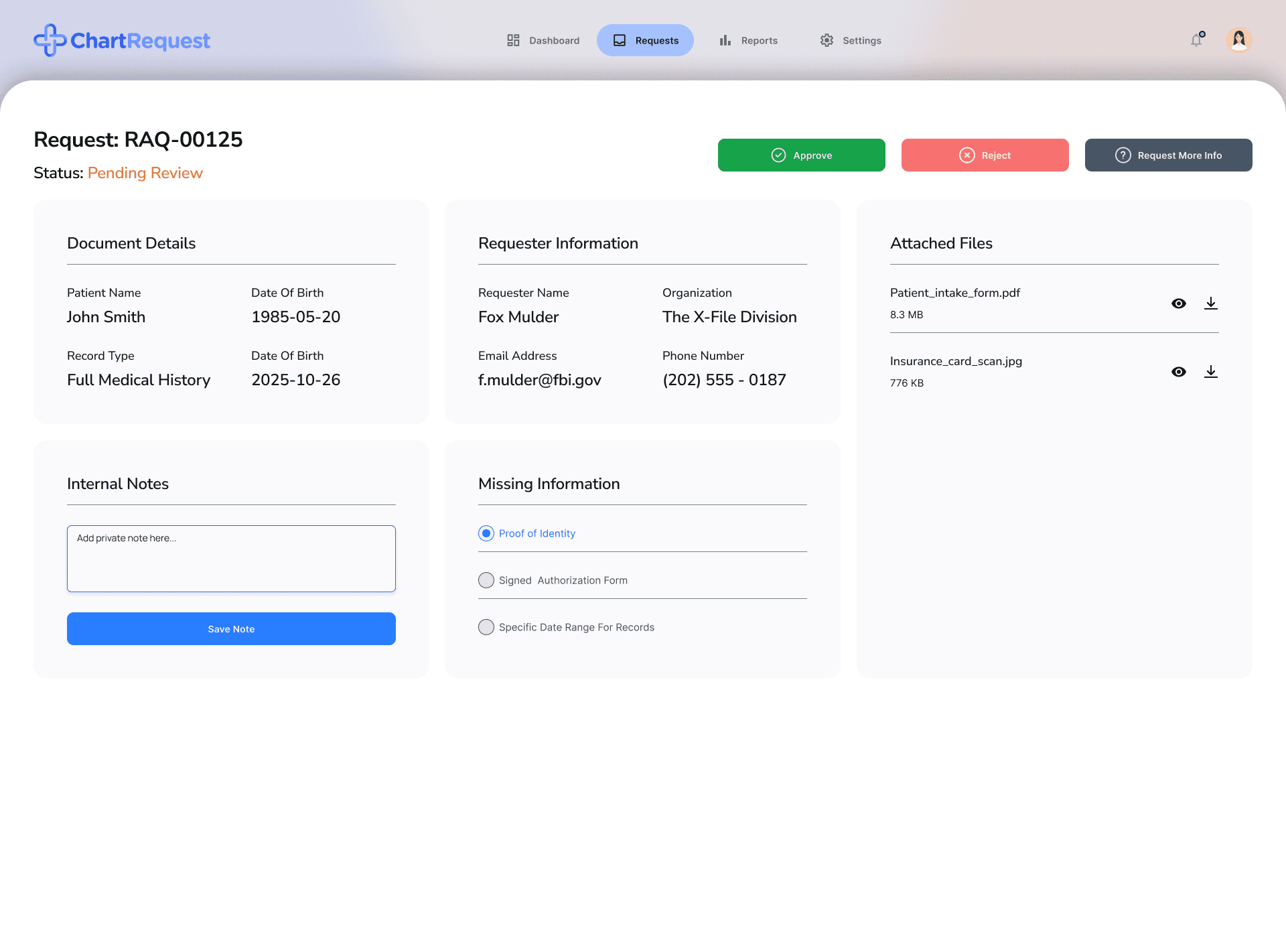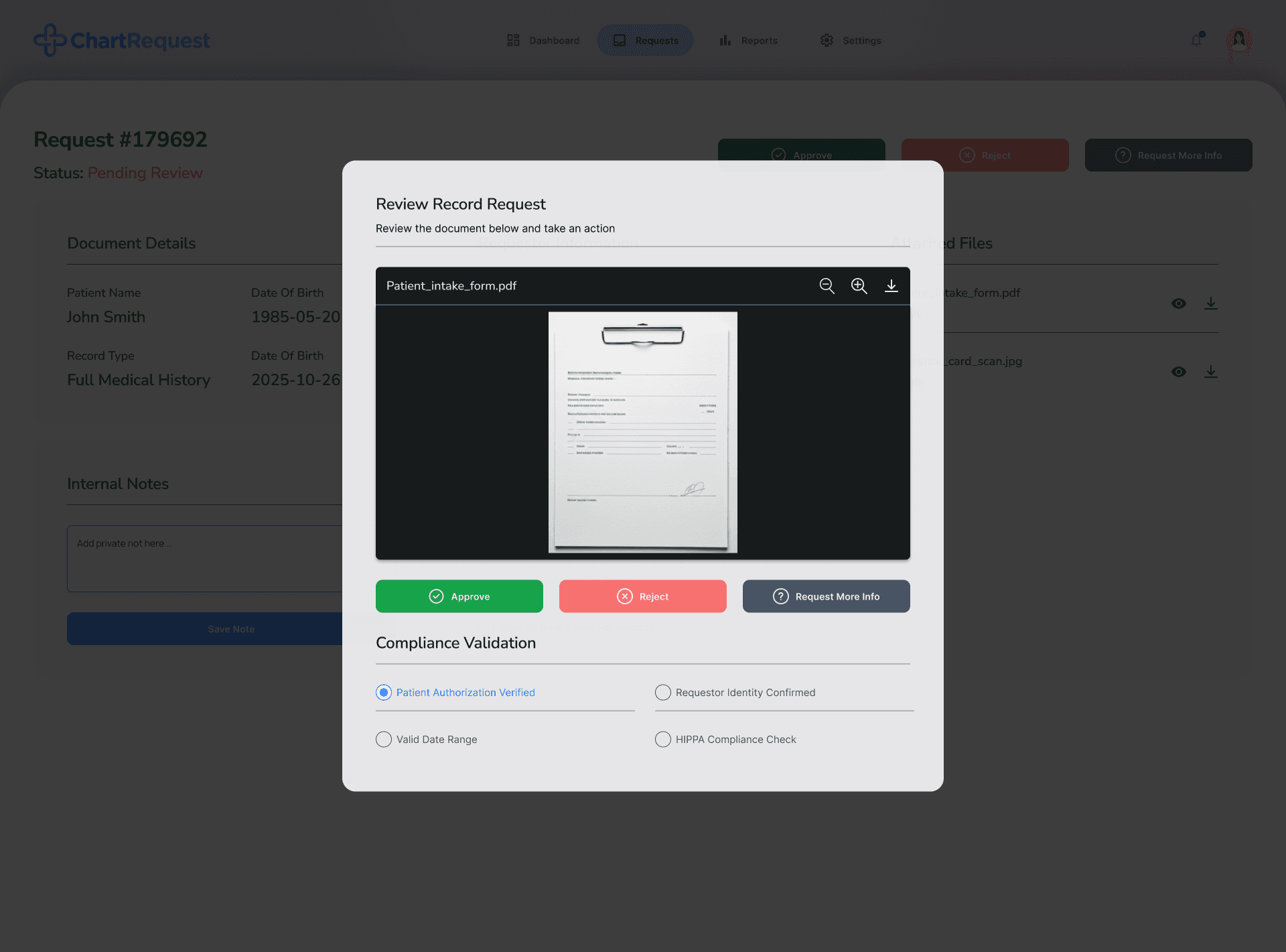 Complete view of patient, requester, and documents for accurate decision-making.